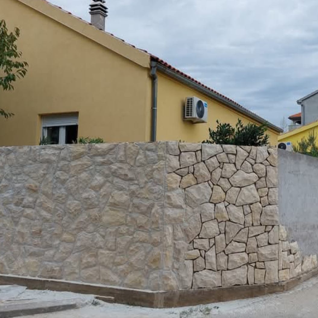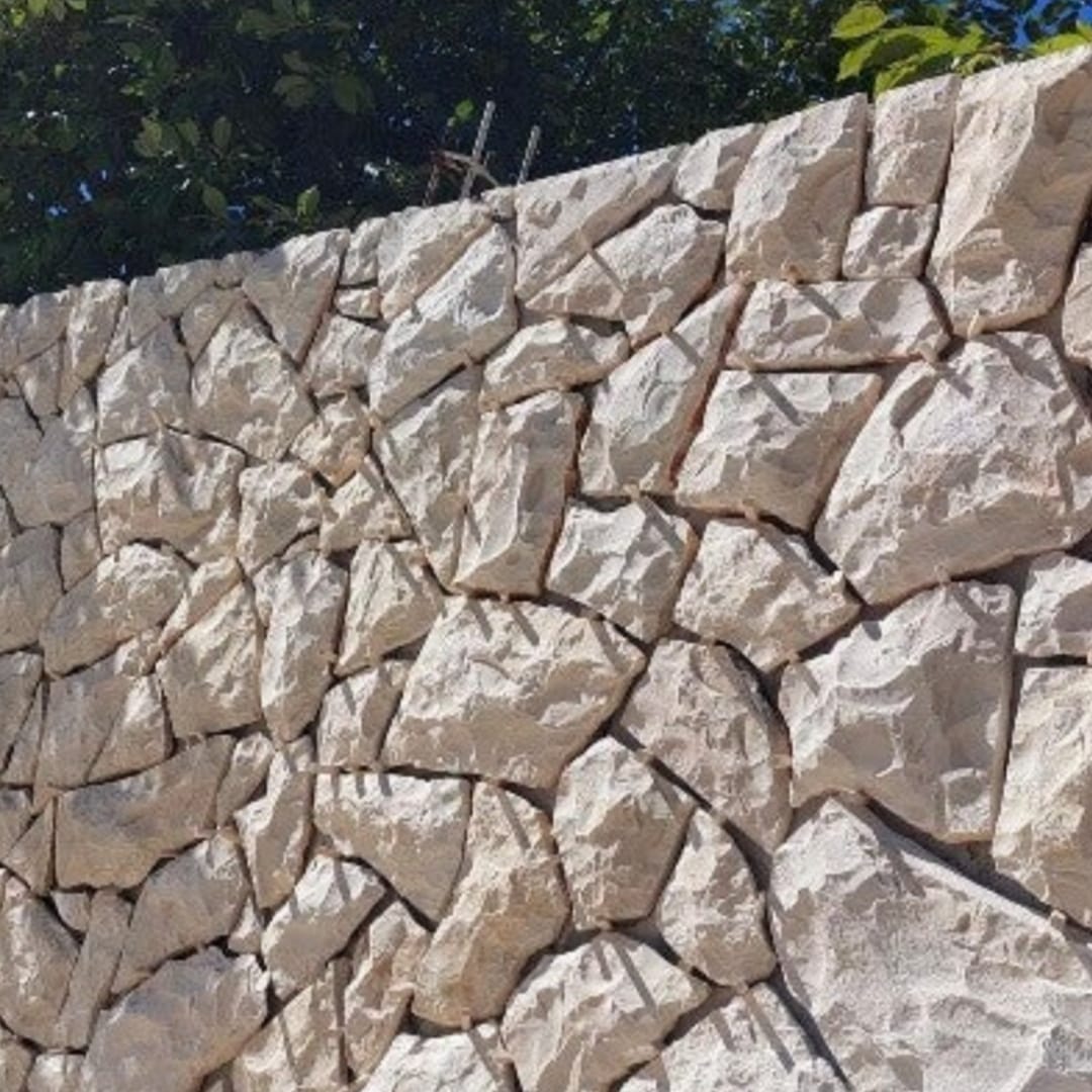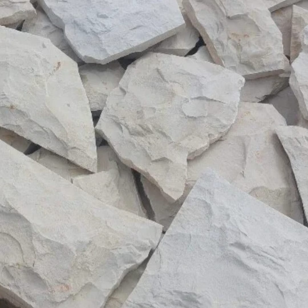 Rustikaler weißer URSA: Hergestellt aus Benkovac Plattenstein mit unregelmäßiger Form, eignet sich dieser Stein für die Verkleidung von vertikalen Flächen. Die Farbgebung variiert von Weiß bis Hellcreme, wobei die Vorderseite einen Teil der natürlichen Oberfläche beibehält. Die Standarddicke beträgt 2–3 cm.