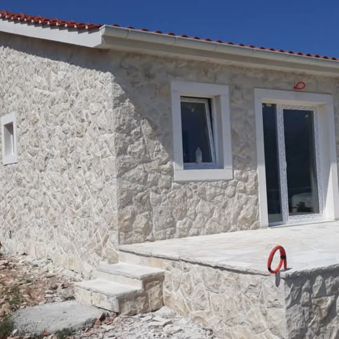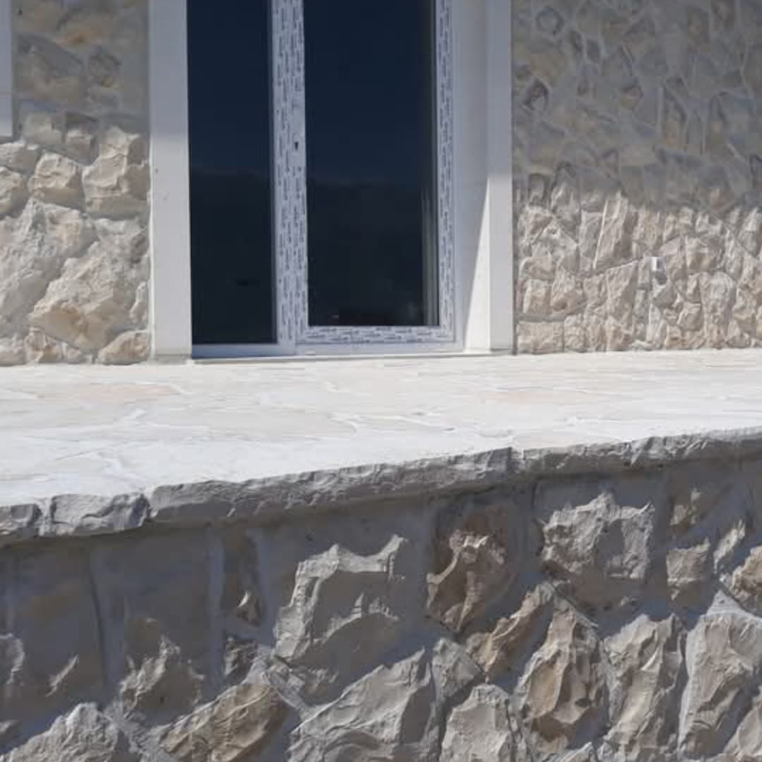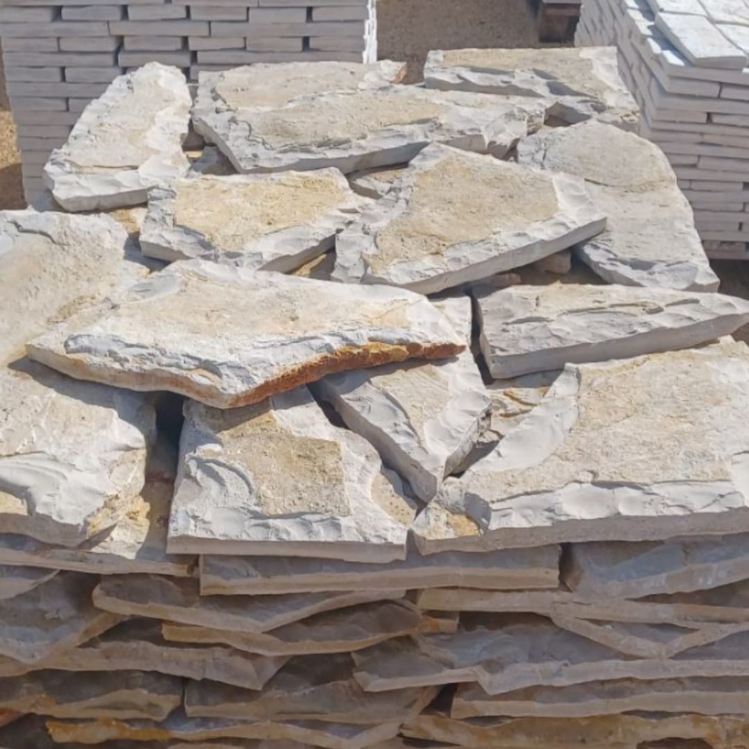 Rustikaler weißer URSA: Hergestellt aus Benkovac Plattenstein mit unregelmäßiger Form, eignet sich dieser Stein für die Verkleidung von vertikalen Flächen. Die Farbgebung variiert von Weiß bis Hellcreme, wobei die Vorderseite einen Teil der natürlichen Oberfläche beibehält. Die Standarddicke beträgt 2–3 cm.